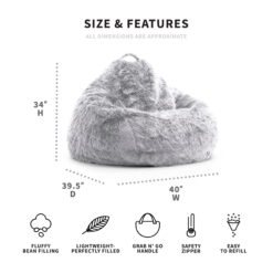 - The perfect large bean bag chair measuring atLooking for a chair that will make a big statement? Measuring in at 40″ W x 39.5″ D x 34″ H, the Big Joe Teardrop is a large shape for spaces that need absurdly awesome comfort! You’ll love the unique design and shape of this chair with a perfect blend of back support and coziness thanks to the super-soft shag faux fur. It’s the perfect luxurious addition to bedrooms, dens, dorms, rec rooms, and living rooms. It’s filled with a scientifically identified amount of bean filling so when you sit on it, it’s super comfy! And, bean refill bags are sold separately so you can give it a pick-me-up whenever needed, since all well-loved bean bags compress over time. For child safety and durability reasons, we intentionally break off the outside zipper pull before shipment. If you need to open your bag, simply use a paperclip to pull it open. Detailed instructions can be found on the warning label attached to your Big Joe. The cover is not removable, but may be spot cleaned as needed.
