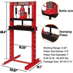 The Torin Big Red T51201 heavy-duty steel H-frame hydraulic garage/shop floor press is designed for straightening, bending, pressing and stamping. Equipped with a 12 ton (24,000 lbs.) capacity bottle jack with a working range from 10-1/2 in. to 35 in. Manually raise and lower the table surface for the best working distance for the job. Includes arbor press stamping plates that feature V-blocks and a 180° guide design. Features high quality precision springs for slowly and safely bouncing back after pressing down operation. The piston-ram is treated and polished to resist skiving. After a thorough chemical wash to ensure a long-lasting finish and to help prevent rust, it’s treated with a powder-coated, lead-free paint, providing a durable coating which is oil, grease and dirt-resistant for easy cleanup. Spring return ram speeds up your work. Get tremendous pressure with very little effort for all your arbor and press out jobs. Includes a limited 1-year manufacturer warranty.