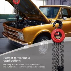 This manual hand lift chain block hoist features a 2 ton (4,000 lb) load capacity and is equipped with a mechanical load brake that allows for precise operation. It’s equipped with (2) heavy-duty steel hooks with a safety latch clasp that rotate a full 360-degrees without twisting and bending. Rotating components are mounted on roller ball bearings to reduce friction and increase efficiency. Protected by a cold rolled steel cover that protects the chains and gear system. It can be attached to a trolley as a traveling chain block for a secure lift. The 1/4″ diameter chains are constructed from premium 20Mn2 alloy steel with a black oxide finish for added resistance from corrosion and grime. This hand-powered chain hoist uses load-sharing gears which makes lifting heavy loads easy and is intended for the installation of equipment and engine blocks, as well as for loading and unloading goods. It’s ideal for industrial settings and job applications such as factories, construction sites, garages, workshops, warehouses, farms, docks, wharves, and mines.