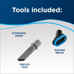 - On-board tool storage including dusting brush, extension wand, and crevice tool