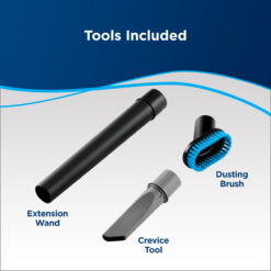 - On-board tool storage including dusting brush, extension wand, and crevice tool