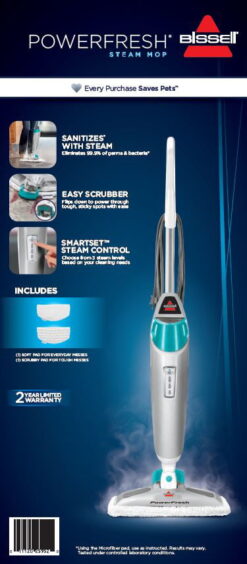 Give your hard floors a shiny, sanitized clean with the variable BISSELL PowerFresh Scrubbing and Sanitizing Steam Mop. Armed with the handy, flip-down Easy Scrubber, you can thoroughly clean tough messes and even grout and crevices. The Bissell steam mop cleans sticky, dried-on spots two times faster than the other leading models.