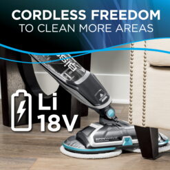 Tired of scrubbing your floors: Let the BISSELL Spin Wave Cordless Hard Floor Spin Mop, 2315A do it for you. This lightweight, spin mop glides across your floors making it easier to clean those tough, sticky messes. The rotating mop pads reduce cleaning effort by scrubbing your floors for you while being gentle and safe to use on sealed hard-surface floors such as tile, linoleum, vinyl flooring, and sealed hardwood floors. This machine comes with a set of soft-touch cleaning pads for everyday cleaning and scrubby pads for tough, sticky messes.