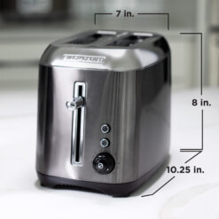 Toast up breakfast with the BLACK+DECKER 2-Slice Toaster. Choose from a variety of shade options for your favorite bread, heat and crisp frozen waffles, and use the bagel setting for bagels and English muffins. The extra-wide slots make it easy to fit any type of bread, and the extra lift ensures you retrieve toasted items safely. Bagel and frozen functions let you customize the toaster for special tasks, delivering perfectly toasted results every time. Plus, the black stainless steel exterior is durable and looks great on the countertop.