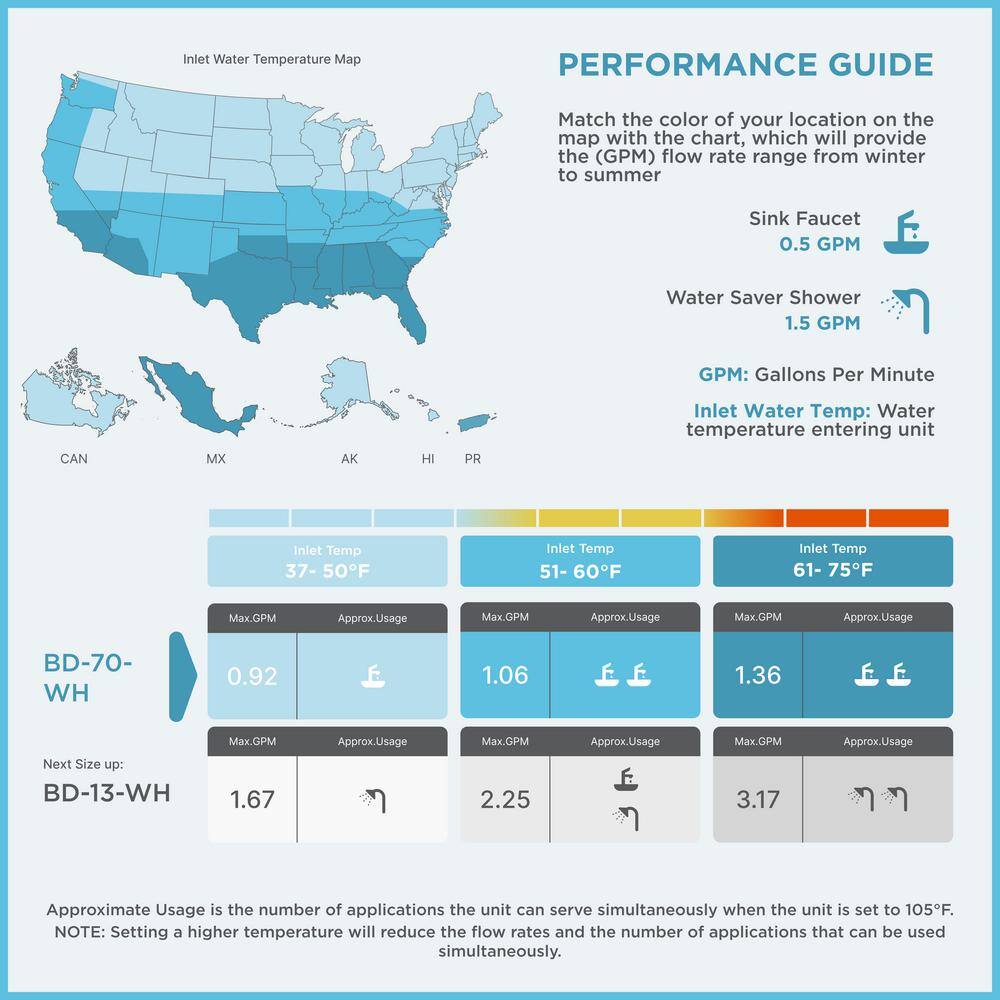 - Durable, point-of-use hot water solution designed to handle two sinks in warm climates or one low-flow shower in warm climates