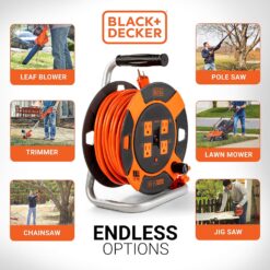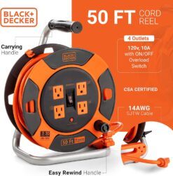 - Power where you need it: make sure you have plenty of outlets while working outside with this extension cord reel with four outlets from Black + Decker, this 50 ft. electric extension cord is CSA certified and has an on/off switch and light indicator