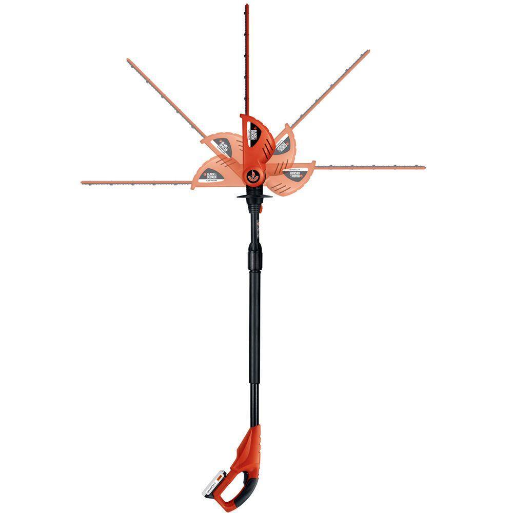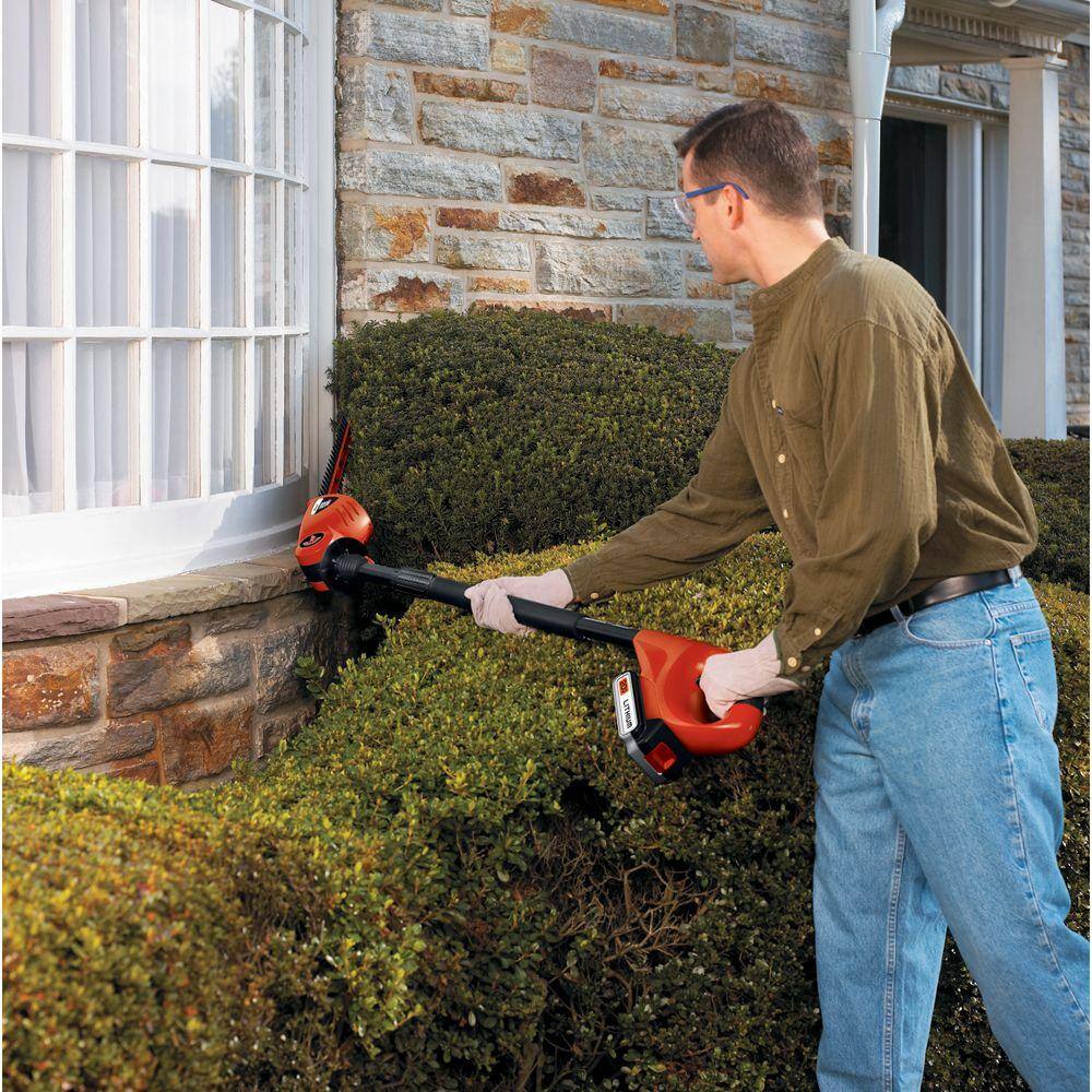 The BLACK+DECKER LPHT120 22 in. 20-Volt Lithium-ion cordless pole hedge trimmer is perfect for those difficult, hard to reach hedges. The pole hedge trimmer has 180° pivoting head that adjusts and locks into five different positions for cutting high hedges. The LPHT120 has 18 in. dual action cutting blades with a 7/16 in. cut capacity. This unit is easy to store and only weighs about 7 lbs.