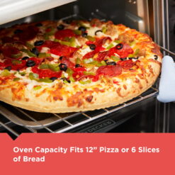 - This large capacity toaster oven fits 6 slices of bread or a 12” pizza.