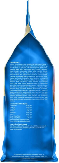 Contains one (1) 7-lb. bag of BLUE Indoor Health Natural Adult Dry Cat Food, Chicken & Brown Rice - Starts with real deboned chicken first for the high-quality protein your kitty deserves.