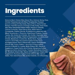 Deboned Beef, Chicken Meal, Brown Rice, Barley, Oatmeal, Peas, Chicken Fat (preserved with Mixed Tocopherols), Flaxseed (source of Omega 6 Fatty Acids), Natural Flavor, Fish Meal (source of Omega 3 Fatty Acids), Dried Tomato Pomace, Pea Protein, Salt, Direct Dehydrated Alfalfa Pellets, Potassium Chloride, Dried Chicory Root, Potatoes, Pea Fiber, Alfalfa Nutrient Concentrate, Calcium Carbonate, L-Threonine, Choline Chloride, DL-Methionine, preserved with Mixed Tocopherols, Sweet Potatoes, Carrots, Garlic, Taurine, Zinc Amino Acid Chelate, Zinc Sulfate, Vegetable Juice for color, Ferrous Sulfate, Vitamin E Supplement, Iron Amino Acid Chelate, Blueberries, Cranberries, Barley Grass, Parsley, Turmeric, Dried Kelp, Glucosamine Hydrochloride, Yucca Schidigera Extract, Niacin (Vitamin B3), Calcium Pantothenate (Vitamin B5), Copper Sulfate, L-Ascorbyl-2-Polyphosphate (source of Vitamin C), L-Lysine, Biotin (Vitamin B7), L-Carnitine, Vitamin A Supplement, Copper Amino Acid Chelate, Manganese Sulfate, Manganese Amino Acid Chelate, Thiamine Mononitrate (Vitamin B1), Riboflavin (Vitamin B2), Vitamin D3 Supplement, Vitamin B12 Supplement, Pyridoxine Hydrochloride (Vitamin B6), Calcium Iodate, Dried Yeast, Dried Enterococcus faecium fermentation product, Dried Lactobacillus acidophilus fermentation product, Dried Aspergillus niger fermentation extract, Dried Trichoderma longibrachiatum fermentation extract, Dried Bacillus subtilis fermentation extract, Folic Acid (Vitamin B9), Sodium Selenite, Oil of Rosemary
