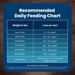 Up to 15 lbs. 1/4 – 1 ¼ cups* 16 to 25 lbs. 1 ¼ – 1 ¾ cups* 26 to 40 lbs. 1 ¾ – 2 ½ cups* 41 to 60 lbs. 2 ½ – 3 ½ cups* 61 to 80 lbs. 3 ½ – 4 ¼ cups* 81 to 100 lbs. 4 ¼ – 5 cups* Over 100 lbs. Feed 5 cups* + ½ cup for each additional 20 lbs. *Use a standard 8-oz. measuring cup. Note: Individual dog’s requirements may vary due to age, breed, environment, and activity level. Adjust food as required to maintain optimal body condition, and ask your veterinarian if you are unsure.