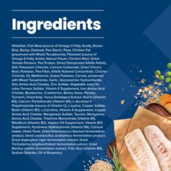 Whitefish, Fish Meal (source of Omega 3 Fatty Acids), Brown Rice, Barley, Oatmeal, Peas, Pea Starch, Chicken Fat (preserved with Mixed Tocopherols), Flaxseed (source of Omega 6 Fatty Acids), Natural Flavor, Dried Tomato Pomace, Dried Yeast, Chicken Meal, Calcium Carbonate, Direct Dehydrated Alfalfa Pellets, Salt, Potassium Chloride, Dried Chicory Root, Alfalfa Nutrient Concentrate, Choline Chloride, Dicalcium Phosphate, DL-Methionine, L-Threonine, Vitamin E Supplement, preserved with Mixed Tocopherols, Dried Sweet Potatoes, Carrots, Glucosamine Hydrochloride, Zinc Amino Acid Chelate, Zinc Sulfate, Vegetable Juice for color, Ferrous Sulfate, Iron Amino Acid Chelate, Blueberries, Cranberries, Barley Grass, Parsley, Turmeric, Dried Kelp, Yucca Schidigera Extract, Niacin (Vitamin B3), Calcium Pantothenate (Vitamin B5), Copper Sulfate, L-Ascorbyl-2-Polyphosphate (source of Vitamin C), L-Lysine, Biotin (Vitamin B7), Vitamin A Supplement, Copper Amino Acid Chelate, Manganese Sulfate, Taurine, Manganese Amino Acid Chelate, Thiamine Mononitrate (Vitamin B1), Riboflavin (Vitamin B2), Vitamin D3 Supplement, Vitamin B12 Supplement, Pyridoxine Hydrochloride (Vitamin B6), Calcium Iodate, Folic Acid (Vitamin B9), Sodium Selenite, Oil of Rosemary.