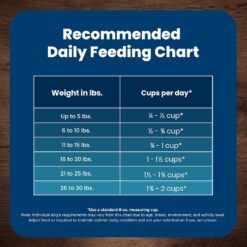 Recommended Daily Feeding Amounts (use a standard 8 oz. measuring cup ): Feed your dog 1/4 to 1/2 cup per Up to 5 pounds of body weight per day; 1/2 to 1 cup per 6 to 10 pounds of body weight per day; 1-to 1-1/4 cups per 11 to 15 pounds of body weight per day; 1-1/4 to 1-1/2 cups per 16 to 20 pounds of body weight per day; 1-1/2 to 1-3/4 cups per 21 to 25 pounds of body weight per day; 1-3/4 to 2 cups per 26 to 30 pounds of body weight per day. Calorie Content (ME calculated, as fed): 3,503 kcal/kg, 428 kcal/cup. Meal Frequency: 1 Meal Per Day. Transition to Blue Freedom: Start by mixing 25% of Blue Freedom with your dogs old food, and gradually increase the proportion of Blue Freedom over the next 14 days. Preparation Options: Dry crunchy and delicious nutrition nuggets and LifeSource Bits right from the bag. Dry with Water–add warm water and mix to fully release flavors and aroma. Be sure to have a dish of cool, fresh water available at all times.