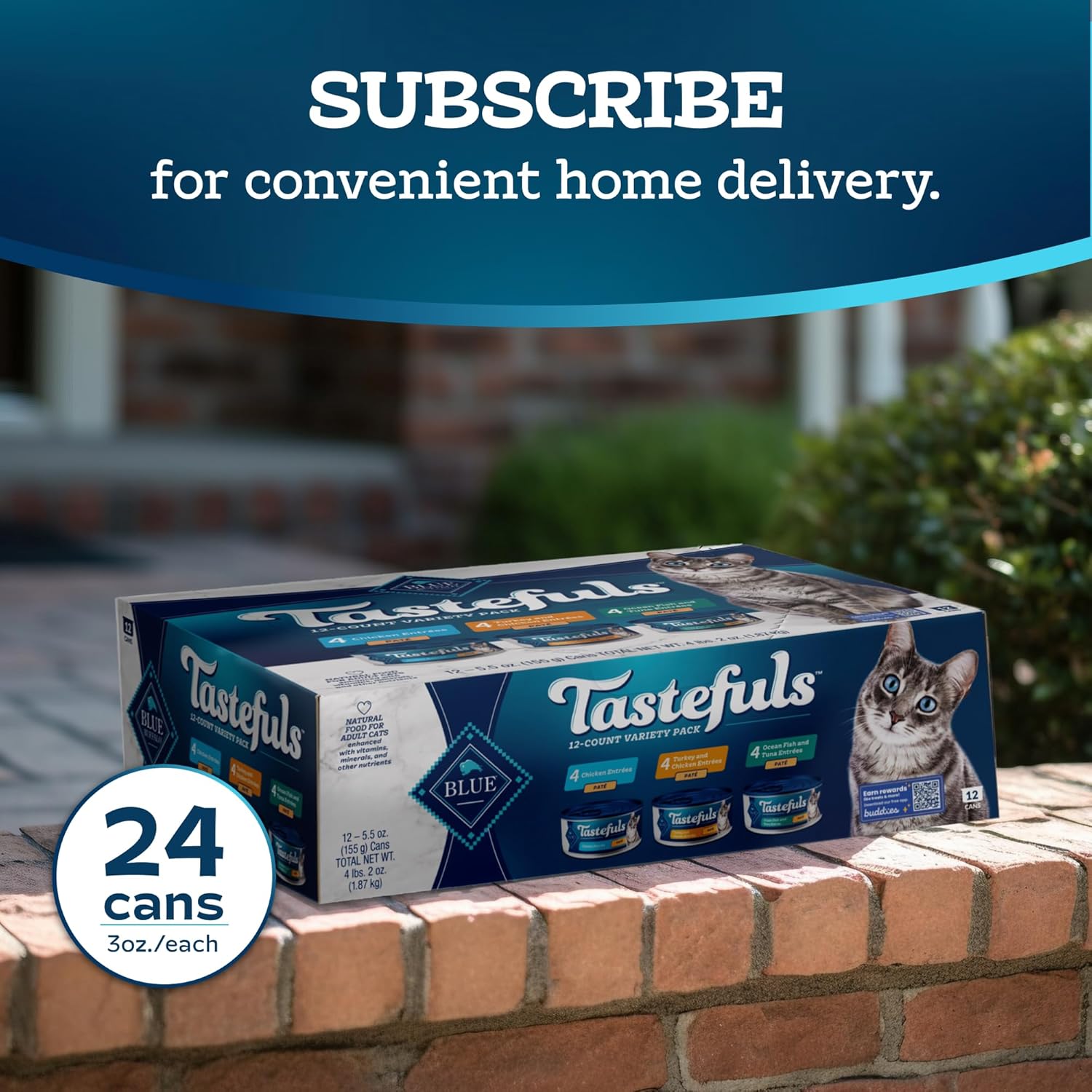 - Contains: Twenty-four (24) 5.5-oz cans of BLUE Tastefuls Wet Cat Food, including (8) Chicken, (8) Turkey & Chicken, and (8) Ocean Fish & Tuna Paté Entrées