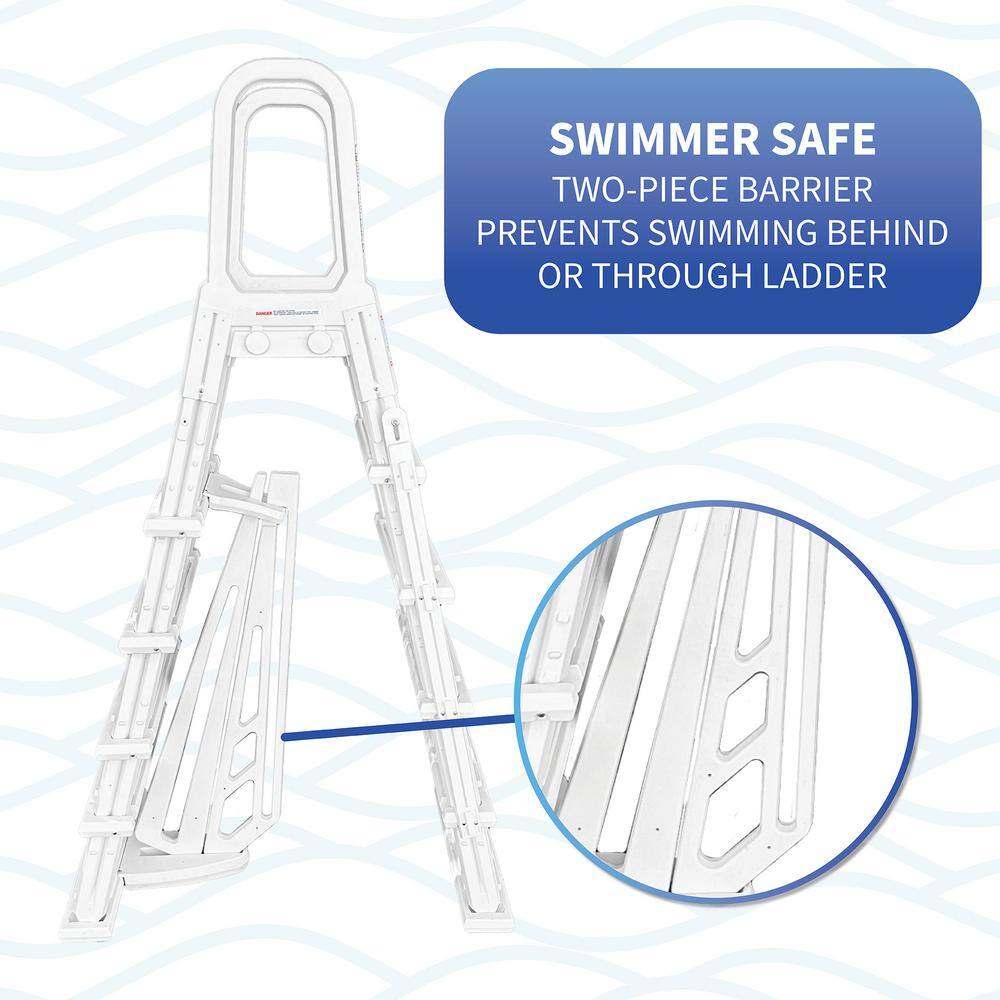 - ANTI-ENTRAPMENT BARRIER – A two-piece barrier prevents children from swimming behind the ladder or through the treads. The barrier system also reduces algae build-up by allowing water and chemicals to circulate freely.
