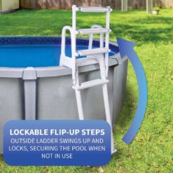 - FLIP UP STEPS – To prevent unsupervised and unwanted entry when the pool is not in use, the outside part of the ladder can be flipped up and locked in place. Simply push down on the step portion to raise the treads.