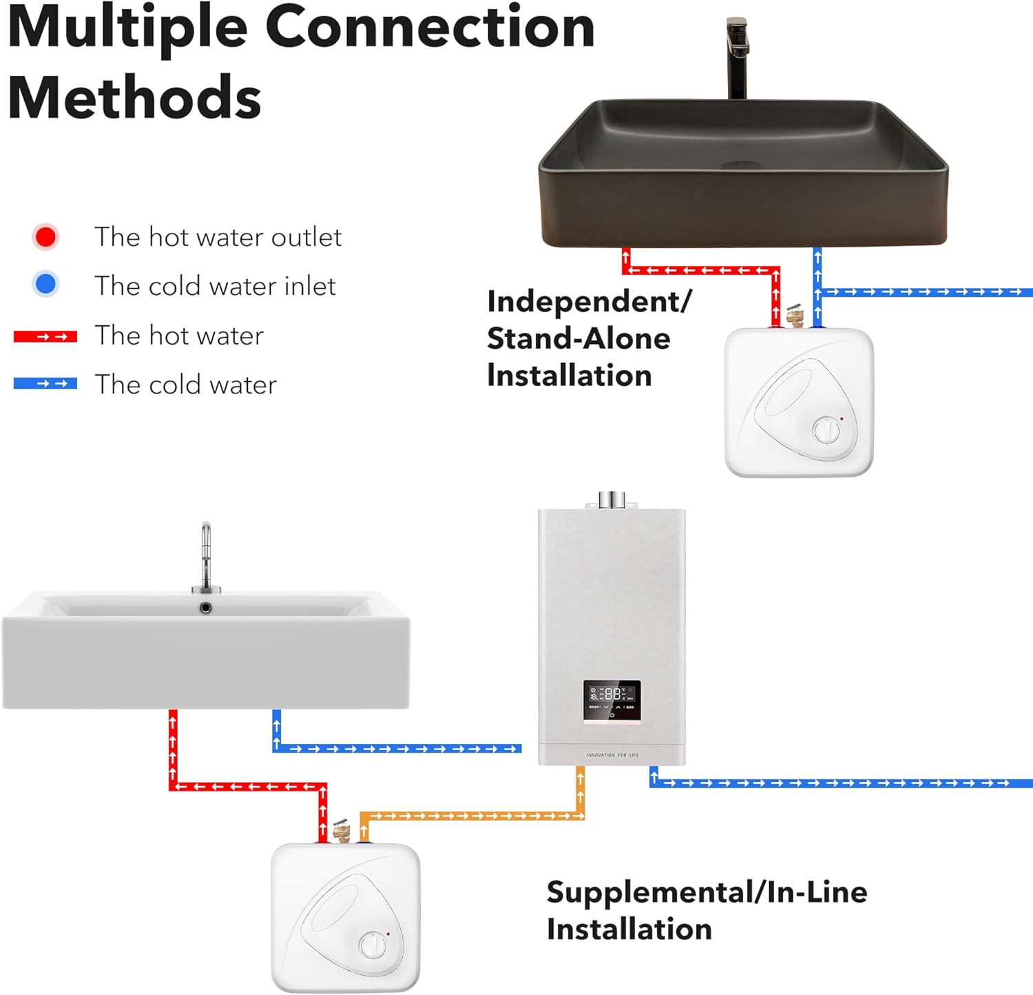 - EASY INSTALLATION: The instant hot water heater comes with a 3.28-foot power cord for easy connection. It can be used independently for a single sink or installed in series with a larger system to supply hot water to multiple sinks.