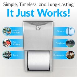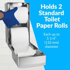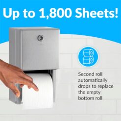 - DISPENSING CAPACITY – Holds two rolls up to 5 1/4″ (135mm) diameter (1800 sheets). Extra roll automatically drops in place when bottom roll is depleted.