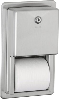 Recessed multi-roll toilet tissue dispenser shall be type-304 stainless steel with all-welded construction, including dispensing mechanism, inner housing and cam; exposed surfaces shall have satin finish. Front of toilet tissue dispenser door shall be drawn, one-piece, seamless construction. Door shall be secured to cabinet with two rivets and equipped with a tumbler lock keyed like other Bobrick washroom accessories. Flange shall be drawn, one-piece, seamless construction. Unit shall dispense two standard-core toilet tissue rolls up to 5-1/4″ diameter (1800 sheets). Extra roll shall automatically drop in place when bottom roll is depleted. Unit shall be equipped with two heavy-duty, one-piece, molded ABS spindles. Theft-resistant, spindles retained in dispensing mechanism when door is locked. Extends 2-3/4″ (70mm) from wall. Rough Wall opening 6-1/4″ width by 11-1/4″ height by 3-1/8″ minimum recessed depth. Measures 7-9/16″ width by 12-1/2″ height.