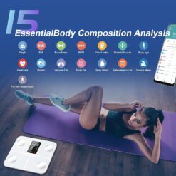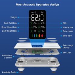 - 【15 Comprehensive Health Metrics】 Monitor your weight, BMI, body fat, body water percentage, muscle mass, skeletal muscle frequency, bone mass, heart rate, lean body weight, biological age, proteins, BMR, heart index, subcutaneous fat, and visceral fat. The large VA display conveniently showcases 8 essential data points, including weight, BMI, and heart rate.