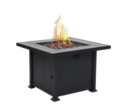 This Ashland Fire Pit Table is a great conversation group addition, giving you the ability to extend your outdoor season into the brisk Fall evenings, and cool Spring mornings. • 50,000 BTUs of heat created with the start from an Impulse Ignition. • Steel frame with a porcelain tabletop. • For use with an internally stored 20 lbs. propane tank. (Tank not included.) • Includes lava rocks, steel burner lid, and a light PVC Cover. • 35”square, 24” high, 70.4 lbs. Imagine this American-styled Ashland Fire Table on your back patio, already lit to welcome your guests for the evening. Great for entertaining, this Fire Pit Table is also terrific just to help grant yourself some time, and perhaps a little peace, from the world of reality. Do you remember that trip up North to enjoy Shakespeare in the park? Share the memories with close friends and relive your fun summer travels. Surround yourself in the warmth cast by this powerful heat generating fire table. Adding this Ashland Gas Fire Pit Table to your backyard is like creating an extra room outside, a retreat to enjoy, even when it gets a little chilly. A classic window-pane pattern accents the sides, while the unique porcelain tabletop draws attention to the table’s surface. When the lava rocks have cooled, just place the steel lid atop, and you have made some extended table space for entertaining.