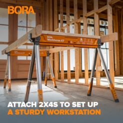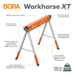 The BORA Workhorse XT is a heavy-duty sawhorse that can handle tough tasks with ease. 1350lb weight capacity and rock-solid stability make it an excellent choice for workshop or jobsite use. Easy set legs to get working fast – in under 10 seconds! Height adjustable legs to find that perfect working weight and make dealing with uneven terrain a breeze. 2x brackets on each end of the Workhorse XT and the predrill top, make building worktables fast and simple. All steel construction, durable powder coat finish, galvanized legs and non-marring feet make the BORA Workhorse XT the perfect choice for any jobsite.