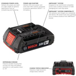 This 2 Pack features two Bosch BAT612 2 Ah Standard Power Batteries, which each deliver the power you need at a light weight for general applications such as screwdriving and fastening. It provides outstanding runtime in a compact size. It delivers 25% more power and more than 30% runtime compared to previous generation BAT611 1.5 Ah battery. The BAT612 weighs only 0.75 Lbs., which is ideal for professionals who do a great deal of work overhead. It features CoolPack housing, which channels naturally occurring heat from within the inner core of the battery and dissipates it. This results in 100 percent more recharge life versus a battery without CoolPack. Built with a single layer of 18650 Lithium-ion cells, the battery is efficient and delivers significant power. It features single-cell monitoring for longer runtime. It features a charge-status indicator with high resolution for clear visibility. It has cold weather operation, working in temperatures down to -4° F. The battery is compatible with Bosch 18V tools, 18V chargers and a growing list of cordless products from AMPShare™ brands. The AMPShare™ System is designed to be multi-brand compatible across many cordless products to make managing your work day easier.