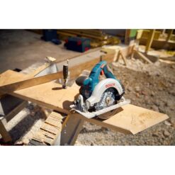 The Bosch CCS180B 18 V 6-1/2 In. Circular Saw Bare Tool can easily cut through 2x (“two by”) material across entire bevel range. This cordless saw provides a convenient 50 degree bevel range, which is handy for times when quick bevel cuts are called for in a difficult situations. The easy-to-read depth-of-cut gauge and bevel scale help make accurate cuts simple. Its ergonomic main handle that is angled for ease in pushing the saw forward. The saw includes a simple depth gauge and bevel scale, a dust blower to help keep the cut line visible, and an anti-snag lower guard to ease into the cut. This balanced saw weighs only 6.7 Lbs. (tool only, not including battery). This is a bare tool kit; the battery and charger are sold separately.
