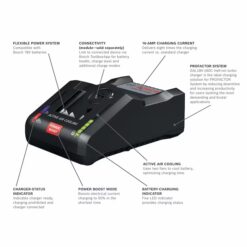 This high-power 18V, 16-amp Hellion turbo charger is fast and faster, getting the user back to work fast in standard mode and even faster in power-boost mode. The Bosch GAL18V-160C is a connected-ready charger that can charge a spent CORE18V 4.0 Ah battery to 50% in 9 min and 80% in 21 min. The GAL18V-160C is also capable of charging an 8.0 Ah CORE18V battery from spent to 50% in 15 min, and 80% in 26 min, It provides active air-cooling, using two fans to cool the battery, optimizing charging time while protecting batteries from overheating. It features a Power-Boost mode, which boosts electrical current charging to 50% in the shortest time. The charger can connect via a Connectivity Module (sold separately), linking it to a connected device for battery health, charge level and charge mode statuses. Standard and Power-Boost modes are available on the charger. All four available modes – including Max Lifetime and Storage – can be activated via the Toolbox app. Additionally, any of the four available modes can be selected as default mode via the App. The charger features five battery charging indicator lights letting you see charging progress from a distance. It is compatible with Bosch 18V Lithium-ion batteries.
