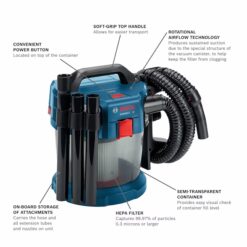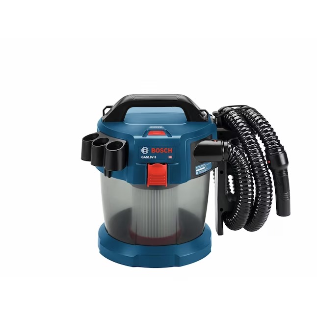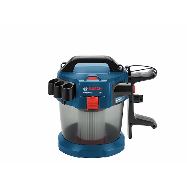 The Bosch GAS18V-3N 18V Cordless Wet/Dry Vacuum Cleaner is a convenient solution for cleanup just about anywhere, including shop, jobsite and truck. Working with the Bosch 18V power system, this cordless vac is built to complete cleanup or emptying chores. It provides sustained performance with long runtime and delivers up to 30 minutes of runtime using a CORE 8.0 Ah Performance Battery (sold separately). This wet/dry vacuum features rotational airflow technology, produced by a special vacuum canister structure, for sustained suction. It forces debris against walls of canister, helping to reduce clogging, and it delivers up to 51 CFM of airflow. Portable, handy and powerful, this vac has a large 2.6 gallon tank but weighs only 10.2 Lbs. (tool with attachments only, not including battery). It features a large, washable HEPA filter, which captures 99.97% of particles at 0.3 microns and larger. The vac also features a complete set of attachments, including three extension tubes plus a standard nozzle, a crevice nozzle, a floor nozzle, a bend/elbow nozzle and a carrying strap. When used with the optional Bosch vacuum hose adapter (sold separately), this vac can be connected with many Bosch power tools and attachments that have dust-collection ports.