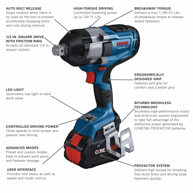 Bosch GDS18V-770CB14 8-Amp 18-volt Variable Brushless 3/4-in square Drive Cordless Impact Wrench (Battery and Charger Included)