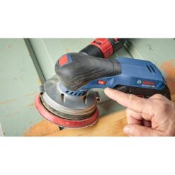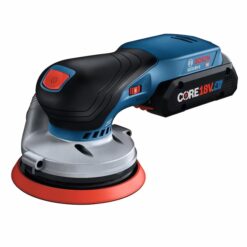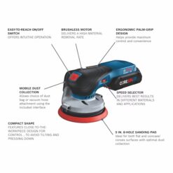 This 18V random orbit sander features a well-balanced ergonomic palm grip, which allows your hand to be closest to the work material to avoid tilting and pressing down, for best results. The Bosch GEX18V-5 Brushless 5 In. Random Orbit Sander has an easy-to-reach on/off switch offers intuitive operation. It has a vibration dampening element to help minimize user fatigue. It has a powerful 18V brushless motor, which delivers similar stock removal to a corded sander. The speed selector delivers best results in different materials and applications. The sander has a 5 In. 8-hole sanding pad, which provides optimal dust collection when the sander is attached to a vacuum or a dust bag. The dust pad is ideal for both flat and concave/convex surfaces. The included dust bag allows mobile dust collection, while the tool has an interface for vacuum hose attachment. It also has soft-start technology, constant speed and a hook-and-loop backing pad. The sander has a compact shape with close-to-the-workpiece design for control in hard-to-reach areas. The kit features a CORE18V 4 Ah Advanced Power Battery, allowing you to keep the power and lose the weight.