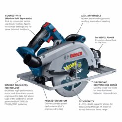 This circular saw delivers corded performance from an 18V cordless 7-1/4 In. saw. The Bosch GKS18V-25GC 18V 7-1/4 In. BITURBO Brushless™ Circular Saw has a 2-1/2 In. cut capacity, easily cutting through 2X (“two by”) material across the entire bevel range. This circ saw is part of the PROFACTOR™ System, which pairs BITURBO Brushless™ Technology with a CORE18V® High Power Battery. BITURBO Brushless™ Technology is a high-performance motor and drive-train system designed to deliver power comparable to high-demand corded tools. Its ECO mode helps get the job done by extending runtime by up to 30%. One-Touch depth-adjustment allows quick, accurate change with one hand. An onboard user interface provides speed-setting control with six settings and tool feedback. It features connectivity (module sold separately), which links users to a connected device via the Bosch Toolbox App to customize settings and receive detailed feedback. It has a 0-50° bevel range, and the auxiliary handle improves stability and handling. The saw is compatible with Bosch as well as select manufacturers’ track-guidance systems, enabling users to make straight cuts fast. It has an electronic convenience brake for less downtime between cuts and a 360° pivoting port directing dust away from the body when the saw is held in either hand.