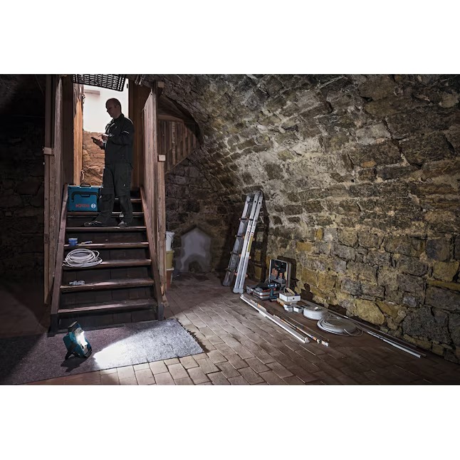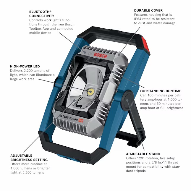 This cordless, portable floodlight with Bluetooth® provides high-powered brightness, with 2,200 lumens that deliver plenty of light for large jobsites. The Bosch GLI18V-2200C 18V Floodlight features Bluetooth® connectivity and outstanding runtime. The Toolbox App connects to the GLI18V-2200C from up to 100 Ft. away with Bluetooth®, to control the floodlight’s operation. Users can turn the light on and off remotely. They can dim the light, set it on a timer, check the battery status and control groups of lights using a mobile device. It delivers great runtime provided by rechargeable Bosch 18V batteries (not included). The light provides 100 minutes of runtime per battery amp-hour at 1,000 lumens and 44 minutes per amp-hour at full brightness, enough for an entire workday. The light has an adjustable stand for versatile positioning, a 5/8 In.-11 thread mount and an IP64-rated water- and dust-resistant case for durability. This is a bare tool; the battery and charger are sold separately.