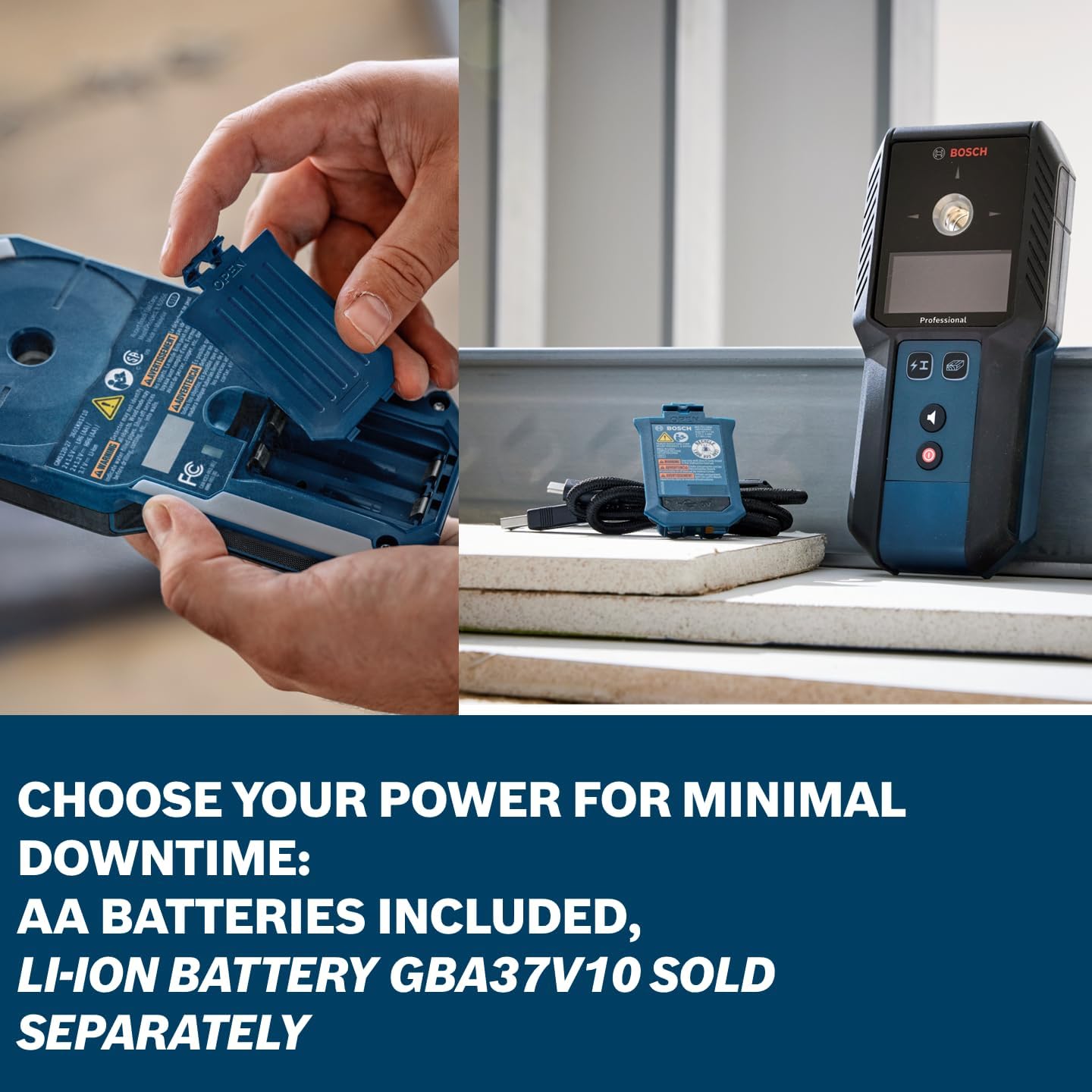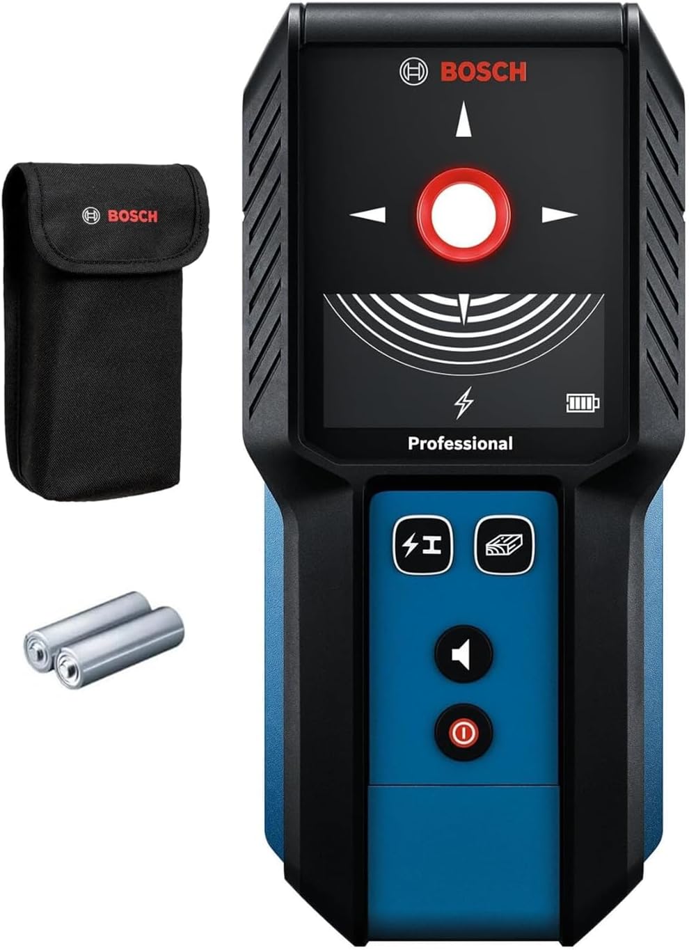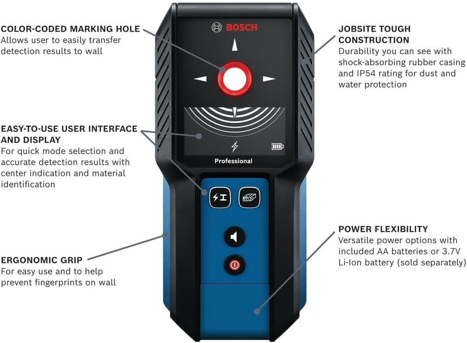 The Bosch GMS120-27 Wall Scanner provides quick, easy, and accurate detection of wood and steel studs, metals, and live wires behind drywall. Power flexibility helps keep the scanner up and running on the job with the option to use with the included two AA Batteries or 3.7V Li-Ion battery (sold separately). Get clear, confident results with the intuitive user interface that displays object center indication and material identification. Easy to use, the device glides smoothly across the wall and the color-coded illuminated marking ring makes fast, accurate work of transferring detection results. IP54 rating and shock-absorbing rubber casing help provide added durability on tough jobsites.
