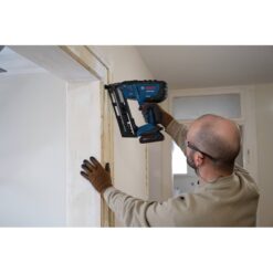 The Bosch GNH18V-16MA 18V Brushless 16-gauge Angled Finish Nailer delivers power and precision in a cordless solution. Compact and ergonomically designed, the 16-gauge angled finish nailer operates at a 20-degree angle giving workers the flexibility to access tight spaces, while also helping reduce worker fatigue. The efficient, brushless motor delivers the power to consistently sink 16-gauge angled finish nails ranging from 1-¼ In. to 2-½ In. which makes it ideal for fastening interior trims, crown moldings, baseboards, window and door casings and other dense wood applications. The 16-gauge finish nailer features an angled magazine with a capacity of 105 nails. When paired with a CORE18V 4 Ah battery (sold separately), it can fasten up to 1,600 nails per charge, ensuring extended productivity. One-handed activation simplifies operation for quick and hassle-free nailing that is suitable for both right- and left-handed users. Equipped with a large viewing window and a no-mar contact tip, the 16-gauge angled finish nailer provides superior line of sight, helping minimize costly mistakes by giving workers improved sight of the workpiece while in use. The dry-fire lockout feature automatically stops operation when down to the last five nails. This not only prevents blank firing but also safeguards the workpiece from potential damage. Make easy and precise adjustments to the depth setting with the ergonomic thumb wheel. Additionally, downtime is minimized as jammed nails can be quickly cleared through a tool-free release mechanism while on the job. An intuitive user interface allows for easy toggling between single and bump-fire modes, turns the LED light on and off, and informs the worker of scheduled maintenance of the tool. An integrated heavy-duty belt hook provides easy portability and storage between tasks.
