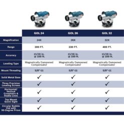 The Bosch GOL 32 automatic optical level features a self-leveling compensator, both horizontal/vertical cross hairs and Stadia lines, 32x magnification lens and large aperture for clear image. Range: 400 Ft., accuracy: up to 1/16 in. at 100 Ft., includes: hard case, lens cap, plumb bob, adjustment tools.