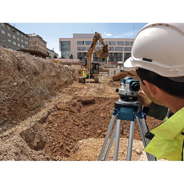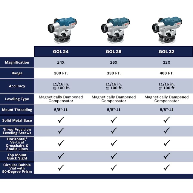 The Bosch GOL 32 automatic optical level features a self-leveling compensator, both horizontal/vertical cross hairs and Stadia lines, 32x magnification lens and large aperture for clear image. Range: 400 Ft., accuracy: up to 1/16 in. at 100 Ft., includes: hard case, lens cap, plumb bob, adjustment tools.