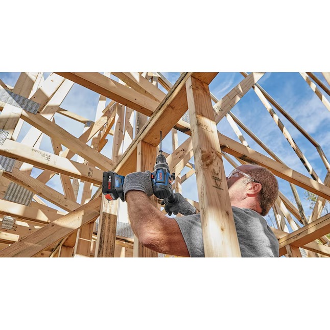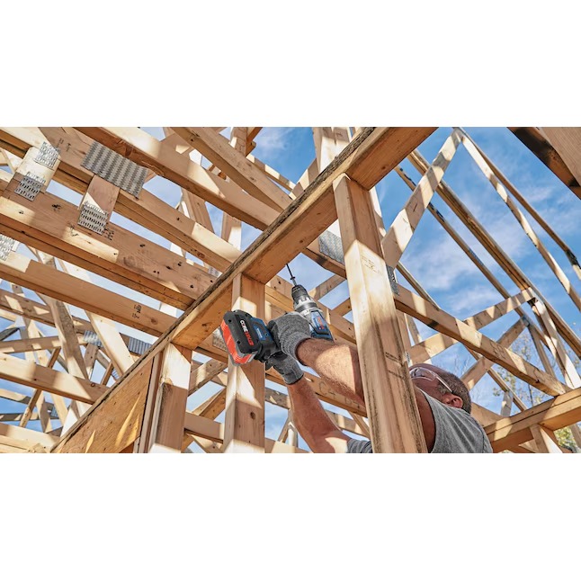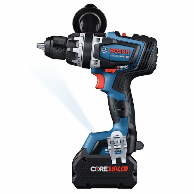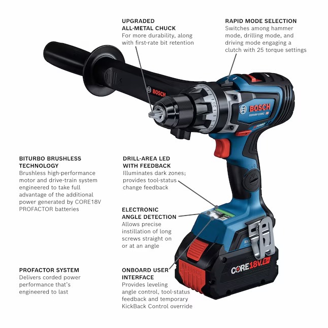This Bosch PROFACTOR™ 18V drill/driver is built for tough drilling and driving jobs, especially drilling large holes straight. The 1/2 In. GSR18V-1330C Drill/Driver is part of the PROFACTOR™ System, which pairs BITURBO Brushless™ Technology with a CORE18V® High Power Battery. BITURBO Brushless™ Technology is a high-performance motor and drive-train system designed to deliver power comparable to high-demand corded tools. This GSR18V-1330C 18V Connected-Ready 1/2 In. Drill/Driver features connectivity (module sold separately), linking to connected device via Bosch Toolbox App to customize settings, receive feedback and set specific angles for the Electronic Angle Detection feature. It has a powerful brushless motor that provides efficient power for up to 1,330 In.-Lbs. of max torque. It has variable speed settings: high speed (0-2,200 rpm) and high power (0-550 rpm). The drill/driver has KickBack Control, which helps reduce the risk of injury from sudden rotational torque reaction in a bind-up scenario and Electronic Angle Detection to ensure accurate drilling at angle. The 25 clutch settings help reduce fastener damage. It has an all-metal chuck that provides durability. The kit includes a CORE18V® 8 Ah High Power Battery, which delivers 50% more runtime and over 75% more power than the CORE18V® 4 Ah battery, powering high-demand applications.