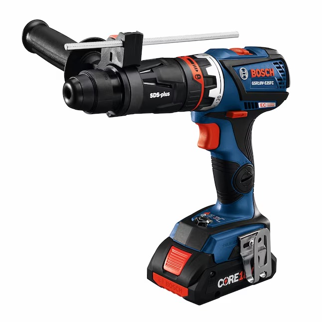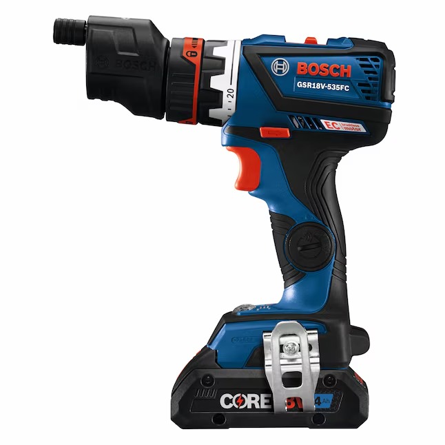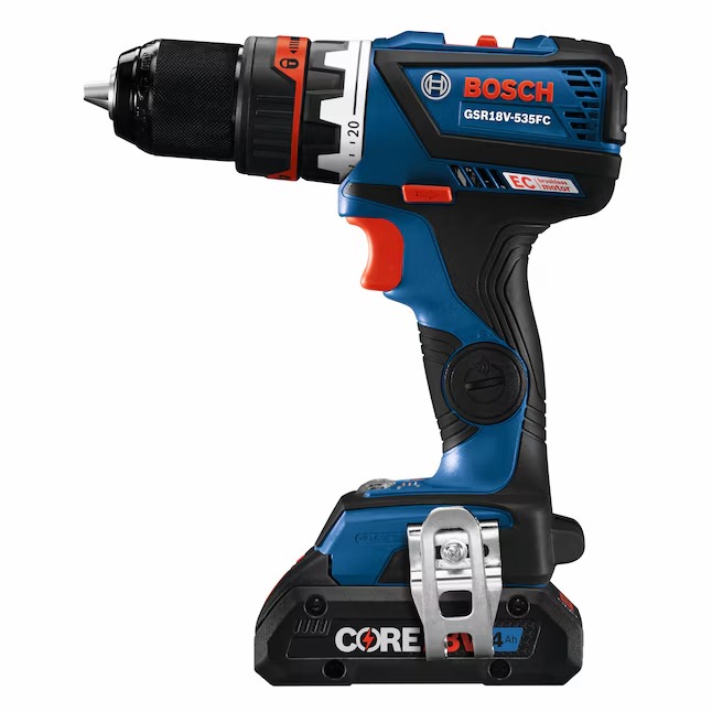 The Bosch 18V Drill/Driver is designed for professionals who are looking for a high-torque connected-ready drill/driver that redefines their limits to get the tough jobs done. is a high-torque connected-ready tool that redefines limits. The drill has a 1/4 In. hex bit holder with quick release, and the 5-In-1 Flexiclick® System includes three pro-grade attachments: a right-angle chuck, an offset hex bit holder and a 1/2 In. keyless metal chuck attachment. The GSR18V-535FCB15 18V Drill/Driver can produce up to 535 In.-Lbs. of torque. Users may also add an optional rotary hammer adapter (not included), converting the drill into an SDS-plus® rotary hammer, for drilling into masonry. The tool has a 1/4 In. hex bit holder with quick release, and the 5-In-1 Flexiclick® System includes three pro-grade attachments: a 1/2 In. right-angle chuck, an offset-angle attachment and a 1/2 In. keyless metal chuck attachment. The kit includes a CORE18V® 4 Ah Advanced Power Battery with next-gen Li-ion 21700 cell technology and an 18V charger. The drill features connectivity (module sold separately) to link to connected device via Bosch Toolbox App to customize settings and receive detailed feedback. The drill has KickBack Control, a precision clutch and an efficient brushless motor.