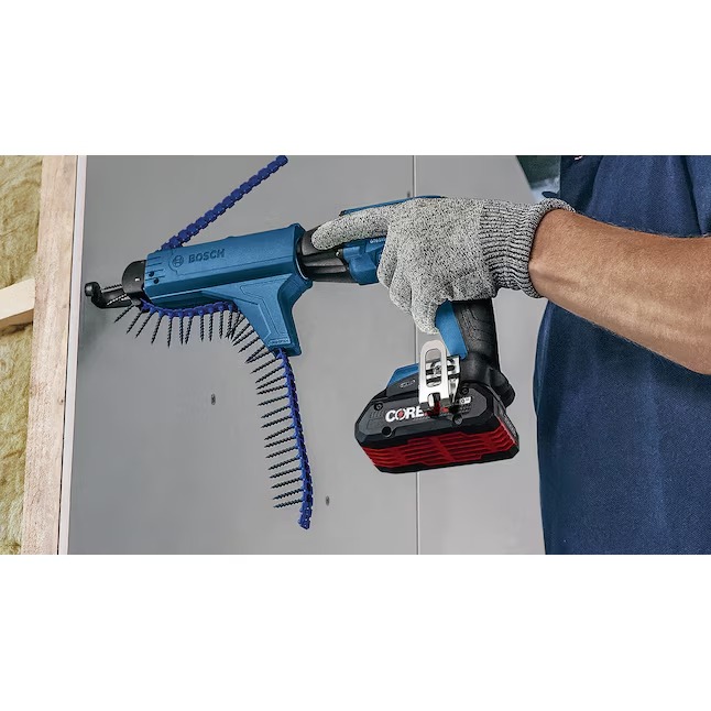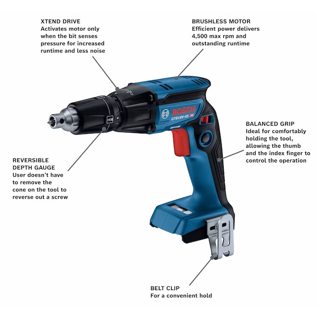 The Bosch GTB18V-45 18V Brushless 1/4 In. Hex Screwgun is designed to get the job done comfortably and fast, without the power cord, when driving drywall screws. This light screwgun features a well-balanced ergonomic grip ideal for comfortably holding the tool, allowing the thumb and the index finger to control the operation. It features Xtend Drive, an intelligent lock-on mode that activates the motor only when the bit senses pressure The tool remains operational but is quiet between screw activations, increasing runtime while decreasing noise. The screwgun has been designed to keep the user’s hand closest to the work material, for max control. And it features a retractable depth gauge, so the user doesn’t have to remove the cone on the tool to reverse out a screw. With an efficient brushless motor, this tool delivers 4,500 max rpm to drive drywall screws into sheet rock, gypsum board and metal or wood studs. This variable-speed screwgun features an easy-to-use lock-on switch and an LED light.