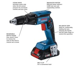 The Bosch GXL18V-291B25 18V Brushless 2-Tool Combo Kit with Screwgun, Cut-Out Tool and two CORE18V® Advanced Power Batteries to complete drywall jobs comfortably and fast, while cutting the cord. The GTB18V-45 Screwgun is light and compact. It features a well-balanced ergonomic grip ideal for comfortably holding the tool and XTEND DRIVE™ intelligent lock-on that activates the motor only when the bit senses pressure, increasing runtime with the ability to drive +2,000 screws on a single charge (with a 4 Ah CORE18V® battery). It provides a 4,500 max rpm motor to drive drywall screws into sheet rock, gypsum board and metal or wood studs. The GCU18V-30 compact cut-out tool provides corded-equivalent performance. When paired with the Bosch GBA18V40 CORE18V® 4 Ah Advanced Power Battery, it can cut up to 300 linear Ft. on a single charge. It is ergonomic and has an LED light on the cut-line. The adjustable foot plate provides depth adjustment. This tool features a IP5X-rated dust-resistant switch and a dust-hood attachment, which hooks up to a vacuum for max dust collection. The kit includes two CORE18V® 4 Ah Advanced Power Batteries, which deliver 2x the runtime compared to previous generation BAT612 2 Ah battery.
