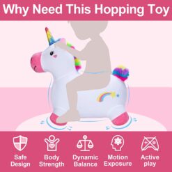 Unique DesignThis hopping unicorn is beautifully made with eye-catching features. Take one look, touch, and fall in love a spectacular gift for your special someone.Childhood Companion Four sturdy legs prevent tipping and falling off and give kids a reliable partner to help strengthen muscles, learn how to maintain balance, and promote brain development.
