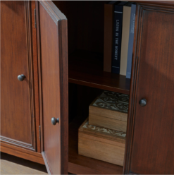 The lustrous finish of this sideboard from our Bradstone Collection makes this a piece that will accent any kitchen or dining room decor. The doors boast beautiful recessed panels with molded edges. Adjust the storage space behind the doors using the adjustable shelves.