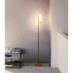 MID CENTURY FLOOR LAMP WITH TWO CYLINDRICAL LIGHTS HAS AN EXPENSIVE LOOK, WITHOUT THE HIGH PRICE – The simple modern gold stem and beautiful opaque lights create an upscale feel that highlights mid century and contemporary design. Whether for the office, living room, or bedroom, this upscale lighting is the perfect style lamp.