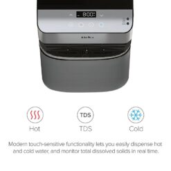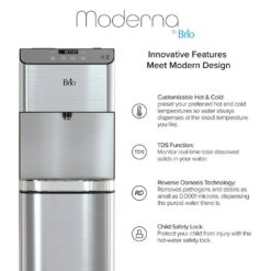 Revitalize with clean water from the Brio Moderna touchless water cooler. Refueling with fresh, clarified water has never been easier; simply wave your hand in front of the digital control panel to activate the single-sensor technology to dispense crisp water. Dispensing water has never been more convenient and sanitary. Reverse osmosis filtration eradicates harmful contaminants most commonly found in tap water to deliver clean drinking water straight to your cup. The illuminated display panel allows you to control water temperature, a clock, nightlight and child lock to ensure everyone’s safety while utilizing the Brio Moderna. Trust in a water system that leads in innovation and health.
