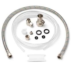 - Adjustable Mounting Brackets, Cold Water Metal T-Valve Connector (7/8″ x 7/8″ x 3/8″), Cold Water Braided Metal Hose, Teflon Tape, Hot Water 3/8″ Metal T-Valve, 1/4″ Pressure Connector, Hot Water Tubing