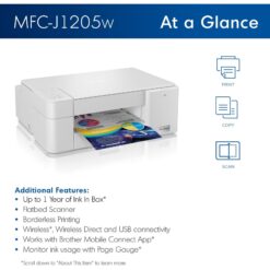 The newly designed brother MFC-J1205W INKvestment tank wireless multi-Function color inkjet printer is sleek, compact, and very affordable. This revolutionary color inkjet printer features reengineered high-capacity ink cartridges that provide up to 1-year of uninterrupted printing using only the cartridges included in-box. Print, copy and scan features can be accessed from your mobile device through the brother mobile connect app. Brother mobile connect has a user-friendly interface that gives you the freedom to print from virtually anywhere and always have access to the status of your printer’s ink usage.