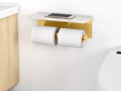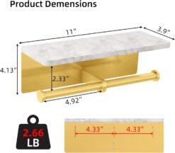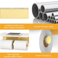 Brushed Gold Toilet Paper Holder with Shelf, New Upgrade Double Toilet Paper Holder with Storage, Marble Roll Toilet Paper Wall Mount for Bathroom Washroom