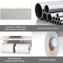 - 【SUS304 Stainless Steel】Enlarged mounting base, covering the original mounting holes, more stable installation; Double-holder for use and storage; Open-sided design, fit for large TP paper roll; Non-slip cover prevent the rolls from dropping; Simple and elegant design, help to decorate your bathroom more attractive and elegant.
